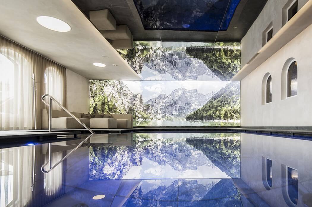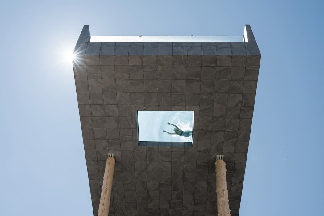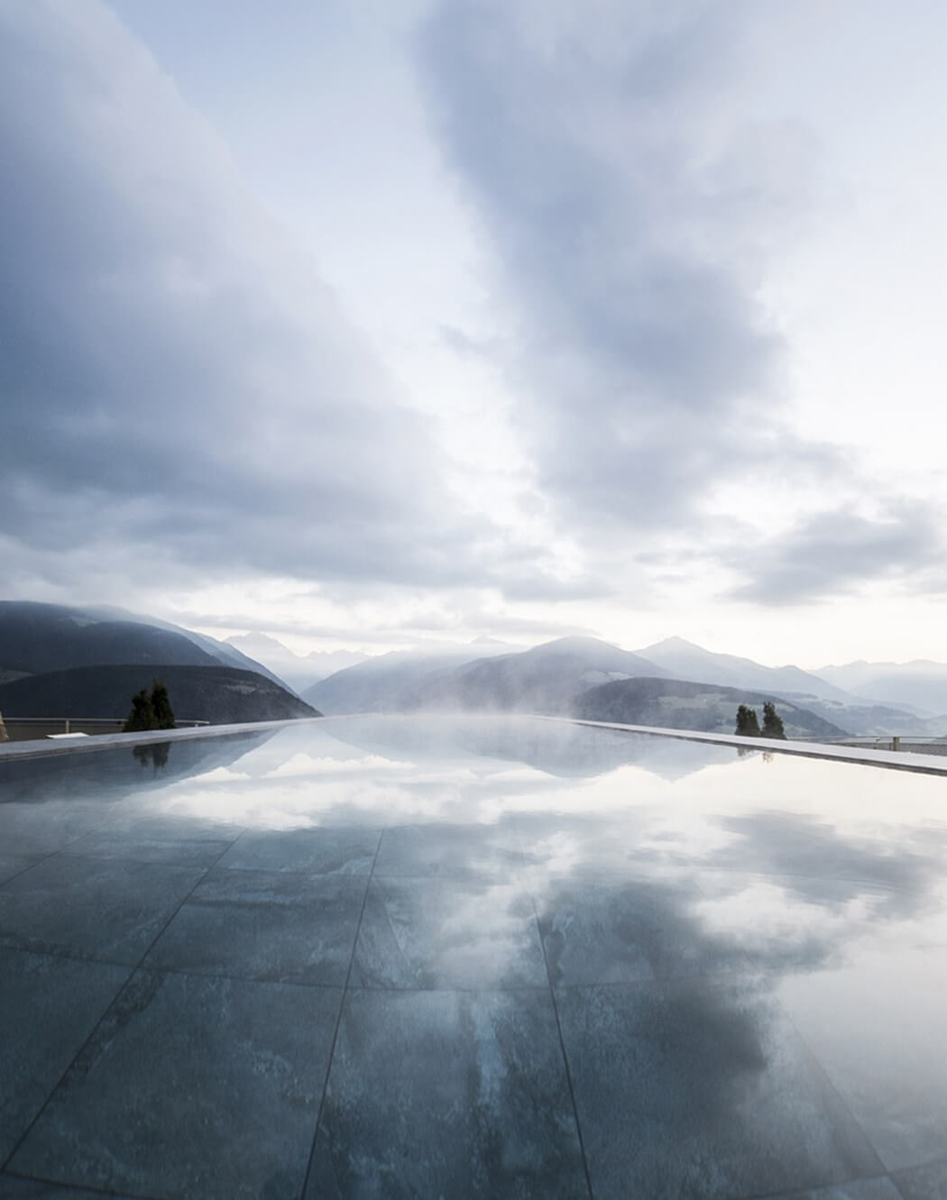 Το νέο τμήμα περιλαμβάνει κελάρι κρασιού, γυμναστήριο, πανοραμική βεράντα και μια εντυπωσιακά τοποθετημένη πισίνα. “Το κλειδί για το έργο ήταν να δημιουργηθεί μια σύνδεση μεταξύ του υφιστάμενου κτιρίου και του νέου σχεδίου, προκειμένου να διατηρηθεί μια ομοιόμορφη και συνεπής έκφραση”, λένε οι αρχιτέκτονες από το noa, το γραφείο που είναι υπεύθυνο για το έργο. Το κεντρικό χαρακτηριστικό του έργου είναι η πισίνα, που βρίσκεται ανάμεσα στις δύο πτέρυγες διαμονής και έχει θέα στην κοιλάδα. Ανάμνηση μιας ορεινής λίμνης, το διαφανές πάτωμα της πισίνας καταργεί το χάσμα μεταξύ κατασκευής και τοπίου, παρέχοντας στους επισκέπτες μια ασυνήθιστη εμπειρία κολύμβησης “στον ουρανό”.