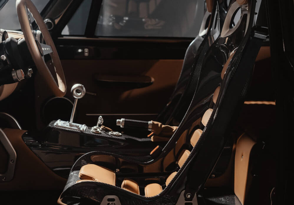 Το εσωτερικό έχει χειροποίητο ύφος: carbon bucket καθίσματα, gated χειροποίητος επιλογέας, δερμάτινα στοιχεία και analog όργανα.