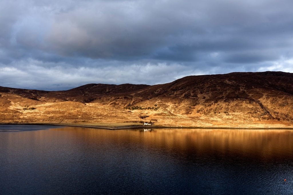 Golden landscape and an isolated house at the edge of the water.