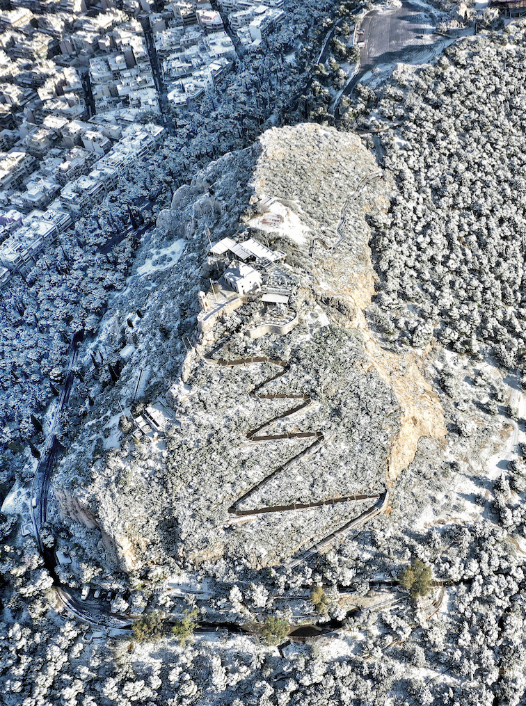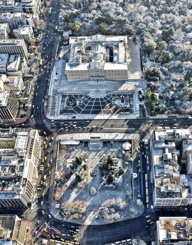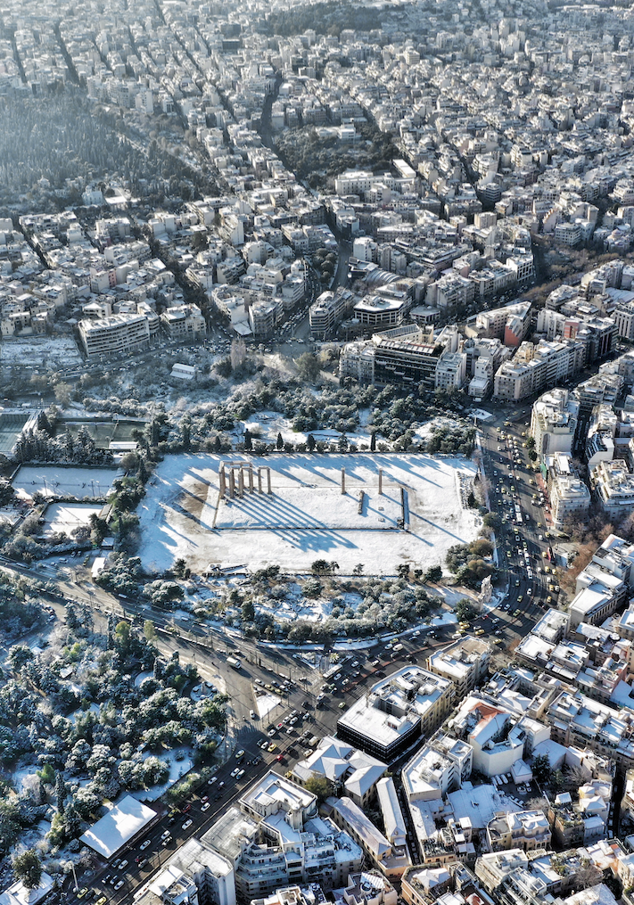 Η πρωτεύουσα της χώρας φωτογραφημένη από ψηλά. Γνωστά σημεία της Αθήνας αποκτούν μια πρόσκ αιρη, γοητευτική εικ όνα, καλυμμένα από το χιόνι.