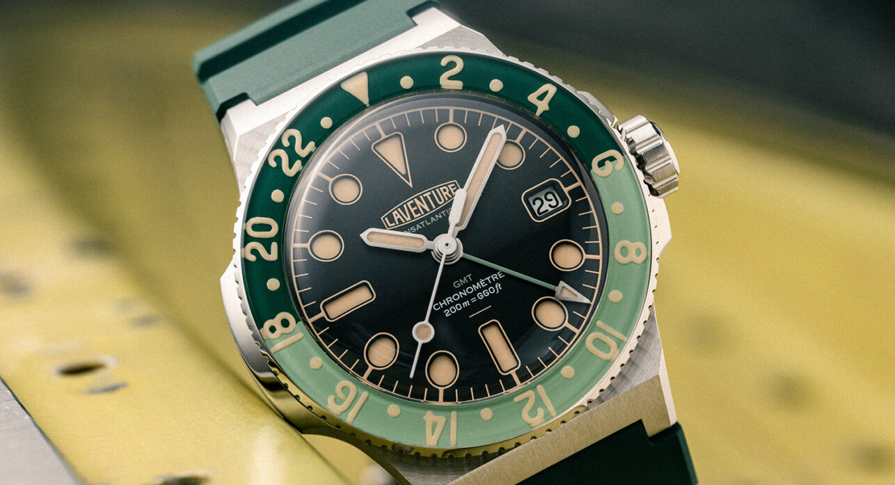 The watch comes with a high-durability green FKM rubber strap and is also available with a stainless steel bracelet. Its design reflects retro elegance inspired by the golden era of transatlantic travel, blending style with practicality.
