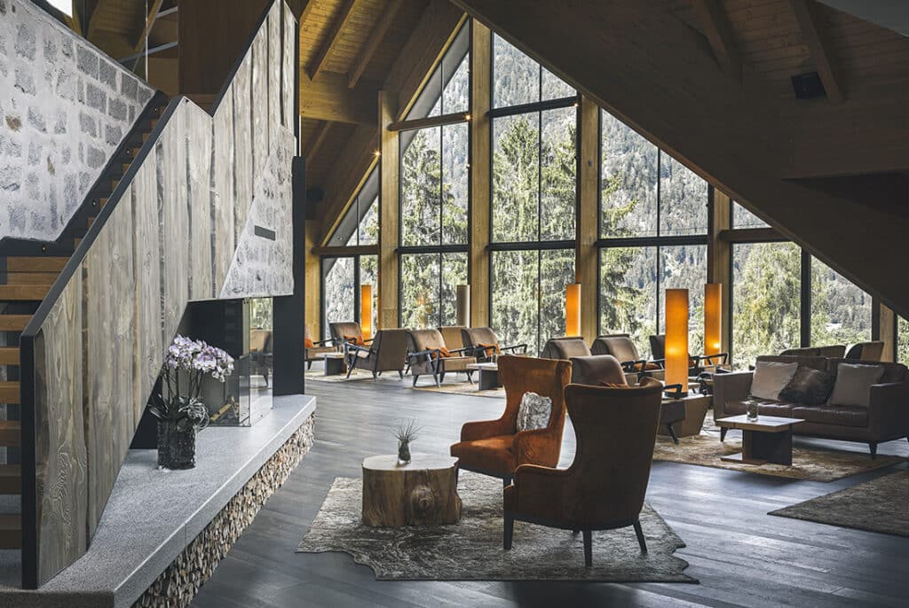 At the core of the property lies its 5,000-square-metre spa, considered one of the largest in the Alps. The wellness concept revolves around “energy therapeutic paths,” inspired by Traditional Chinese Medicine. Different temperature saunas, steam rooms, Kneipp circuits, a salt grotto and heated indoor and outdoor pools form a continuous ritual of heat, water and relaxation, all framed by panoramic mountain views.