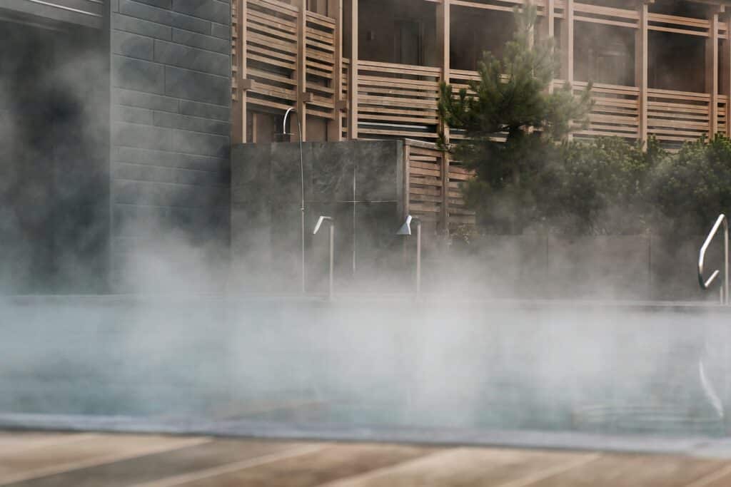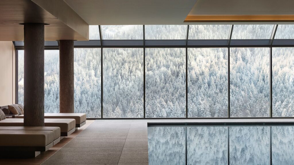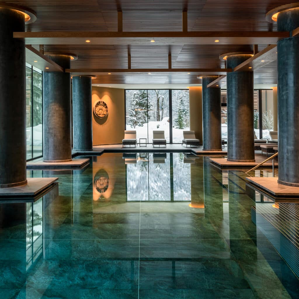 At the core of the property lies its 5,000-square-metre spa, considered one of the largest in the Alps. The wellness concept revolves around “energy therapeutic paths,” inspired by Traditional Chinese Medicine. Different temperature saunas, steam rooms, Kneipp circuits, a salt grotto and heated indoor and outdoor pools form a continuous ritual of heat, water and relaxation, all framed by panoramic mountain views.