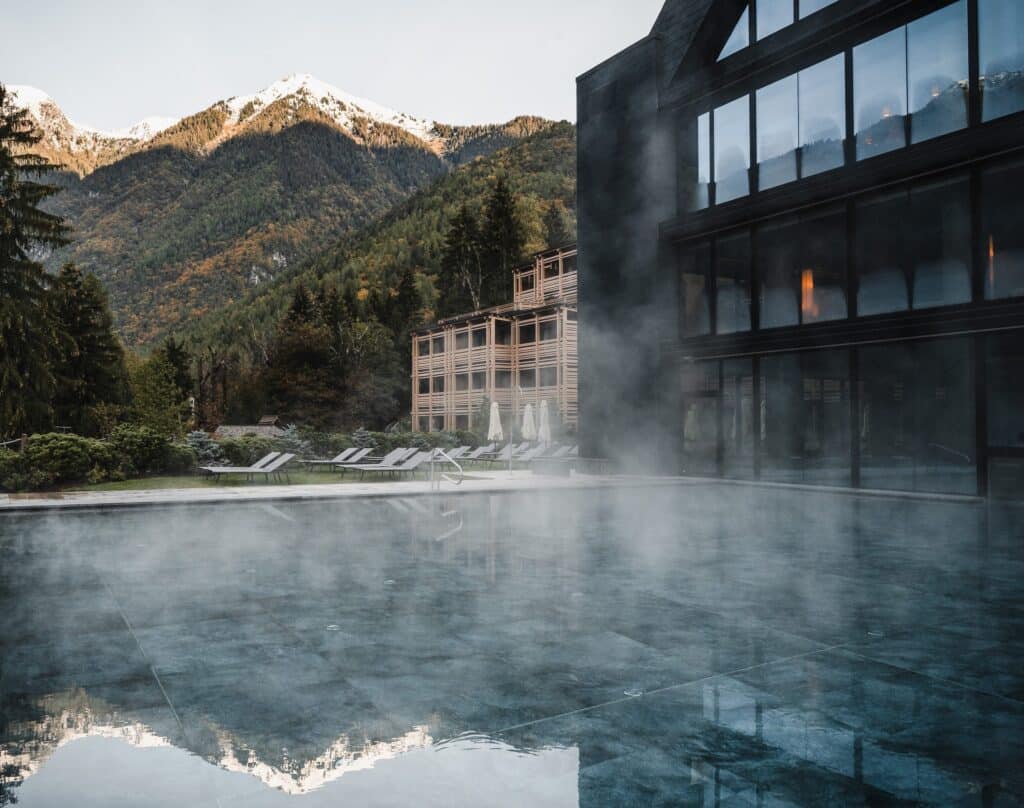 The Lefay Resort & SPA Dolomiti is one of Italy’s most striking alpine wellness destinations. Perched above Pinzolo in the heart of the Dolomites, the resort blends dramatic mountain scenery with a contemporary wellbeing philosophy. Its architecture, built around natural materials such as wood and stone, harmonises seamlessly with the surrounding landscape, creating an immediate sense of calm upon arrival.