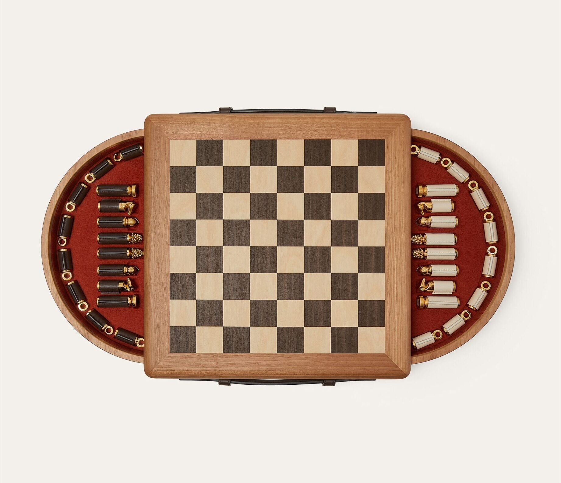 A one-of-a-kind luxury design piece from Loro Piana: the Suitcase Stripe Intarsia Chess Board blends the warmth of handcrafted inlaid walnut and maple wood with the soft touch of rounded leather. Opening the board, you’ll find crescent-shaped drawers house brass chess pieces partially wrapped in fine leather, all crowned with the Maison’s emblematic thistle motif. With an interior lined in cashmere-wool, hand-stitched calfskin loops, and Sun Gold–finish brass components, this chess board is as much a tactile masterpiece as a visual delight—entirely made in Italy.