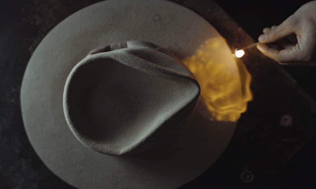 Feathers, velvet, raw fabrics and a match decorate his western style hats, while inside, you always find a silk lining and some kind of symbol.