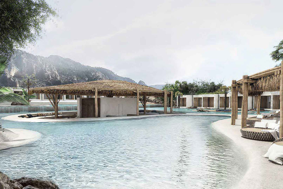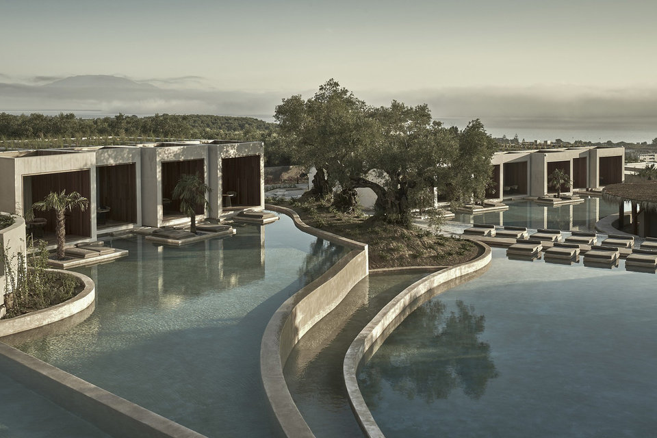 Το αρχιτεκτονικό κόσμημα του νησιού βρίσκεται στη μέση μιας πισίνας 4000τμ η οποία ενώνει αρμονικά τα εστιατόρια, τα μπαρ και τις 93 σουίτες. Οι guests μπορούν κολυμπώντας ν’ απολαύσουν τη μαγική θέα κι έτσι να φτάσουν μέχρι το πριβέ μπαλκόνι τους.