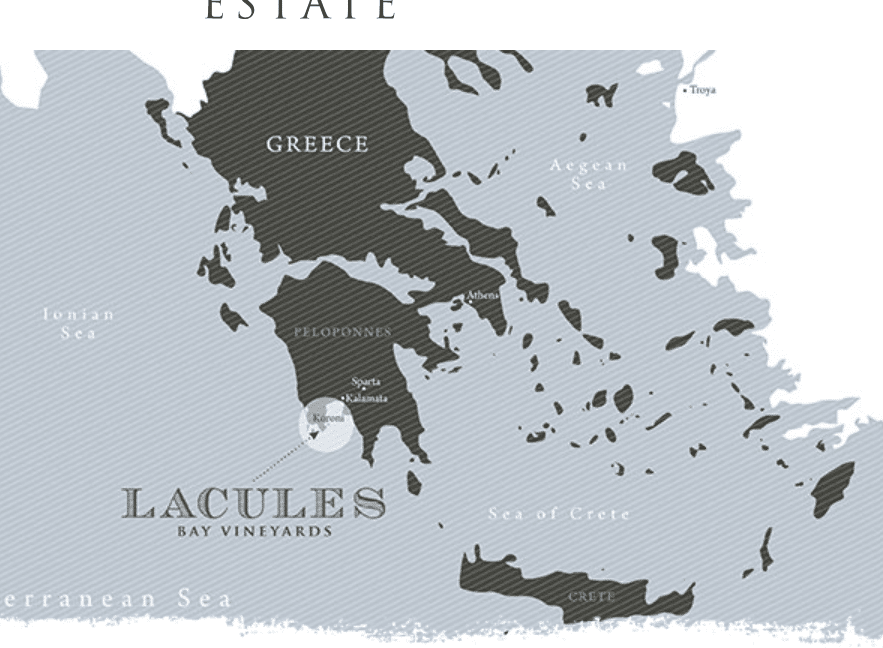 Οι αμπελώνες βρίσκονται ακριβώς πάνω από τον κόλπο Lacules, μια μικρή παραλία στη νοτιοδυτική ακτή της Πελοποννήσου. Τα αμπέλια φυτεύονται γύρω από το οινοποιείο, δίπλα σε αιωνόβιες ελιές και απλώνονται με θέα στη Μεσόγειο Θάλασσα. Οι κλώνοι του των σταφυλιών προέρχονται από τη Γαλλία και επιλέχθηκαν για να ταιριάζουν στο ζεστό κλίμα με σχετικά χαμηλή υγρασία. Η αραίωση των συστάδων και τα καλά στραγγιζόμενα εδάφη προσφέρουν μια καλλιέργεια χαμηλής απόδοσης με συμπυκνωμένα φρούτα που στη συνέχεια μαζεύονται προσεκτικά με το χέρι.