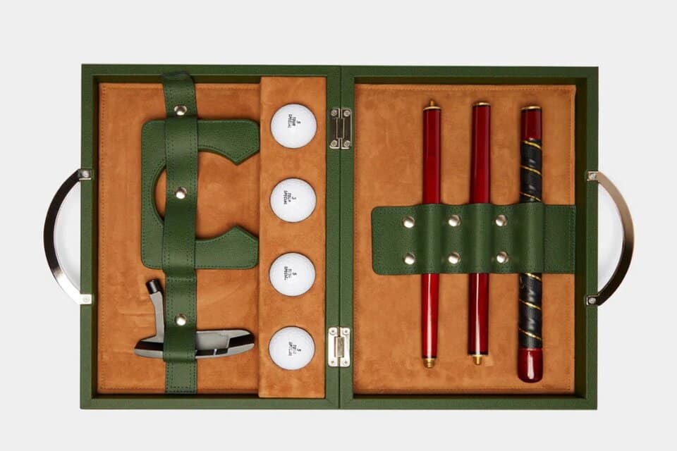 Το σετ περιλαμβάνει μια κομψή θήκη από pebbled δέρμα, τέσσερις μπάλες golf και ένα αποσυναρμολογούμενο μπαστούνι τριών κομματιών, σχεδιασμένο για εύκολη μεταφορά χωρίς συμβιβασμούς στην εμπειρία παιχνιδιού. Κάθε στοιχείο είναι κατασκευασμένο στο χέρι από υψηλής ποιότητας δέρμα, προσφέροντας μια αίσθηση πολυτέλειας που ξεφεύγει από τα συνηθισμένα αθλητικά αξεσουάρ.