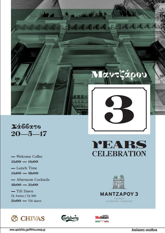 Stylish παρέες, δροσιστικά cocktails σε έναν χώρο που αυτοπροσδιορίζεται ως all day pleasure. Το γοητευτικό νεοκλασικό στον αριθμό 3 της οδού Μαντζάρου, στο Κολωνάκι, γιορτάζει τρία χρόνια λειτουργίας. Ο ομώνυμος πεζόδρομος θα μετατραπεί σε έναν χώρο γεμάτο happenings, special surprises, μοναδικά cocktails και welcome drinks από ευφάνταστους bar tenders και εξαιρετικές μουσικές από γνωστούς djs.