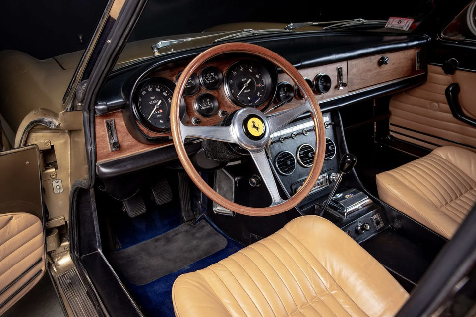 Το 330 που βλέπετε εδώ έρχεται από το 1967 και σε χρυσό χρώμα – όχι στο πρωτότυπο ανοιχτό γκρι του καθώς το αυτοκίνητο βάφτηκε εξ ολοκλήρου με την εξαγωγή του στις ΗΠΑ. Ο πρώτος ιδιοκτήτης του ήταν ο Ιταλός Romeo Pedini, στο γκαράζ του οποίου παρέμεινε μέχρι και το 1972 ώσπου έφυγε για τις ΗΠΑ. Εσωτερικά, διατήρησε το τυπικό μπεζ δερμάτινο σαλόνι ενώ το ταμπλό επενδύθηκε με ξύλο. Νέοι υαλοκαθαριστήρες και ηλεκτρικά παράθυρα προστέθηκαν το 2021. Λόγω της εντυπωσιακής διατηρητέας κατάστασης στην οποία βρίσκεται, η τιμή του αναμένεται να ξεπεράσει τα 450.000 δολάρια.