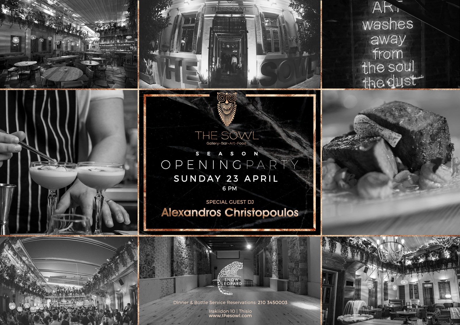 Η μαγική hacienda του The SOWL στο Ιστορικό Κέντρο της πόλης, εγκαινιάζει την νέα season μ’ ένα μεγάλο Opening Party, την Κυριακή 23 Απριλίου στις 6 το απόγευμα, με special guest DJ τον Αλέξανδρο Χριστόπουλο, signature cocktails, Latin American/Mexican menu αλλά και πολλές εκπλήξεις.