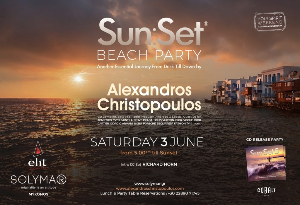 Το μυαλό όλων πλέον βρίσκεται στο τριήμερο του Αγίου Πνεύματος. Εάν λοιπόν είστε από εκείνους που θα επιλέξουν το νησί των Ανέμων αυτό, τότε δεν πρέπει να χάσετε το μεγαλύτερο party. Το Sun:Set Beach Party επιστρέφει στο Solymar για 12η συνεχόμενη χρονιά. Το Beach Party με αφορμή την κυκλοφορία της νέας CD συλλογής* του Αλέξανδρου Χριστόπουλου Sun:Set 5, θα πραγματοποιηθεί το Σάββατο 3 Ιουνίου στις 5 το απόγευμα κατά την διάρκεια του Sun:Set στο SOLYMAR, στο Καλό Λιβάδι, στη Μύκονο.