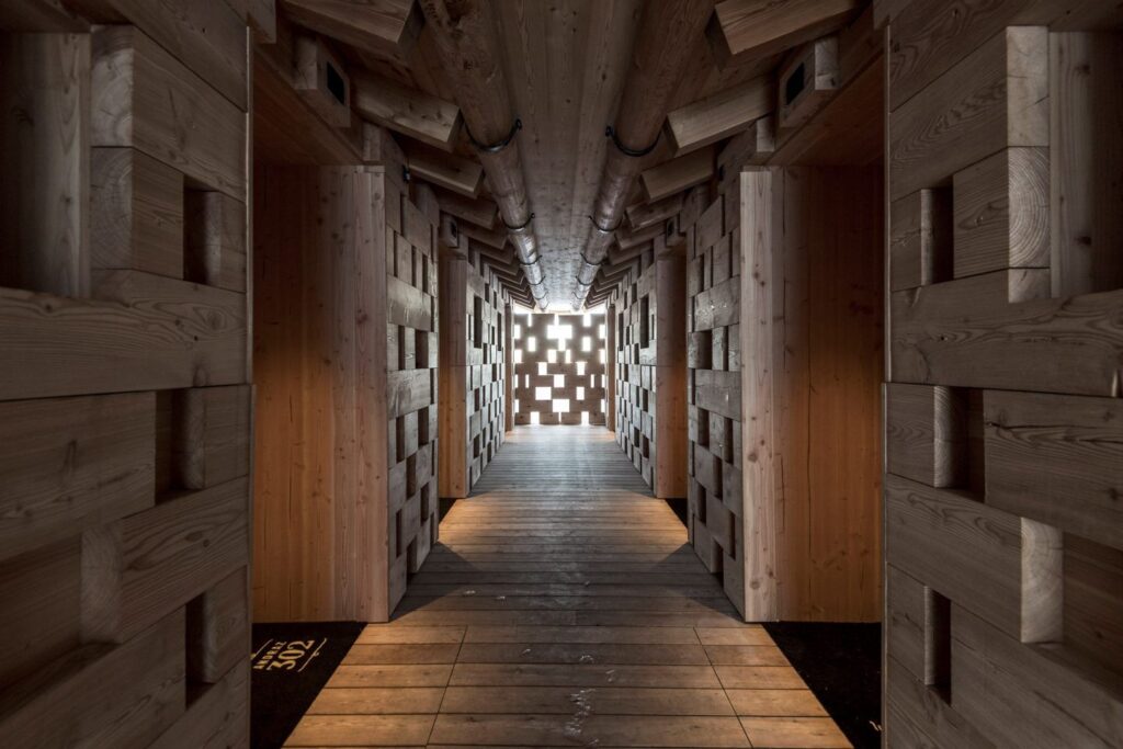 Ξύλινα πάνελ καλύπτουν τους τοίχους και την οροφή, πίσω από τα οποία βρίσκονται ηχοαπορροφητικά πάνελ που βοηθούν στην απόσβεση του ήχου. Αυτό επιτυγχάνεται επίσης με τη χρήση δαπέδου από τσόχα, ένα παραδοσιακό υλικό των Άλπεων.